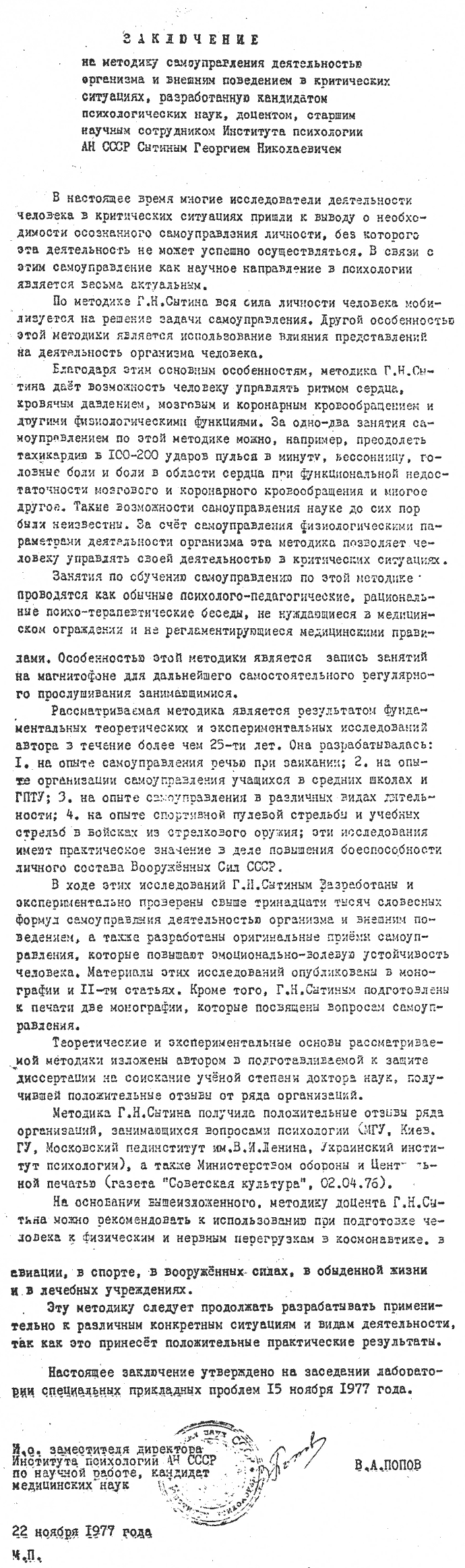 Заключение на применение методики самоуправления деятельностью организма и внешним поведением в критических ситуациях