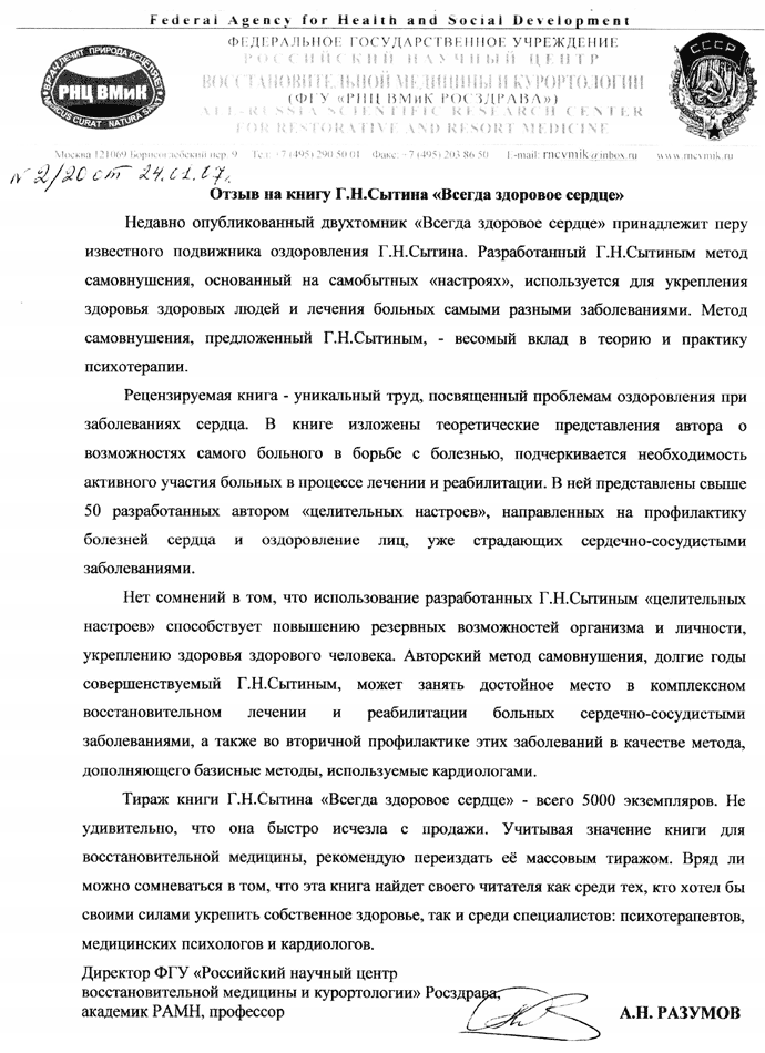 Отзыв академика А. Н. Разумова на книгу Г. Н. Сытина "Всегда здоровое сердце"