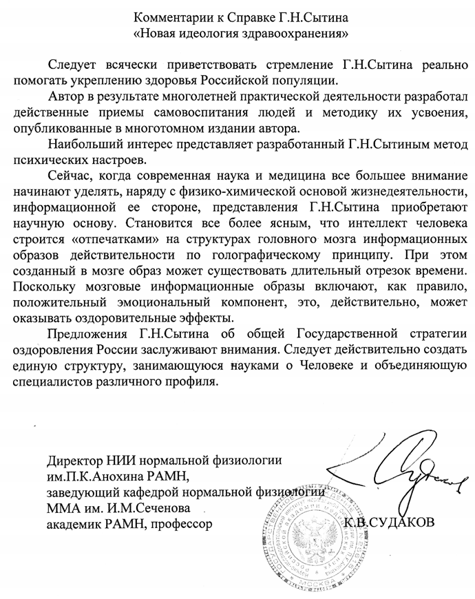 Комментарий академика К. Н. Судакова к научному труду Г. Н. Сытина "Новая идеология здравоохранения"